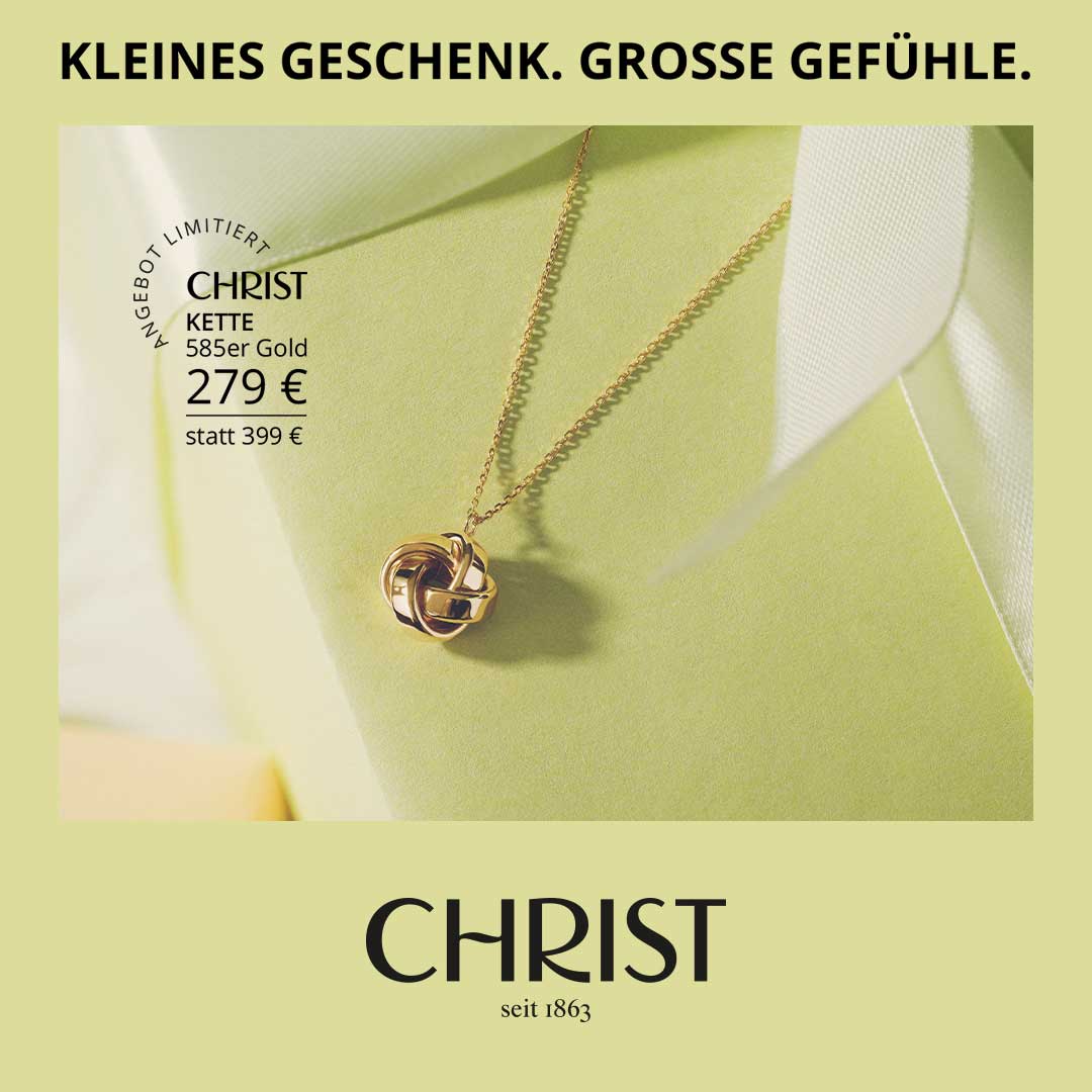 Manchmal reicht eine kleine Geste, um jemandem zu zeigen, wie viel er dir bedeutet. Die feine Kette aus 585er Gelbgold mit verschlungenem Knoten-Anhänger steht für Verbundenheit und Wertschätzung – ein besonderes Geschenk für besondere Menschen. Jetzt zum Aktionspreis von 279 € statt 399 € im CHRIST-Store entdecken.