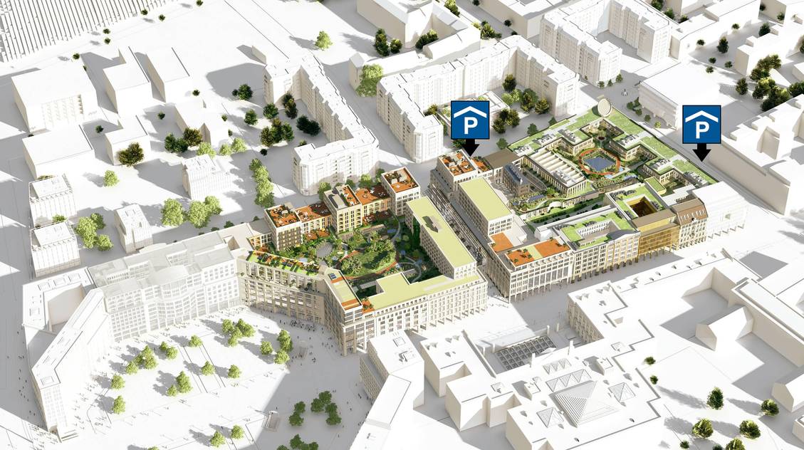 Die Hauptzufahrt zur Tiefgarage befindet sich in der Voßstraße. Eine weitere Zufahrt befindet sich in der Wilhelmstraße 95.